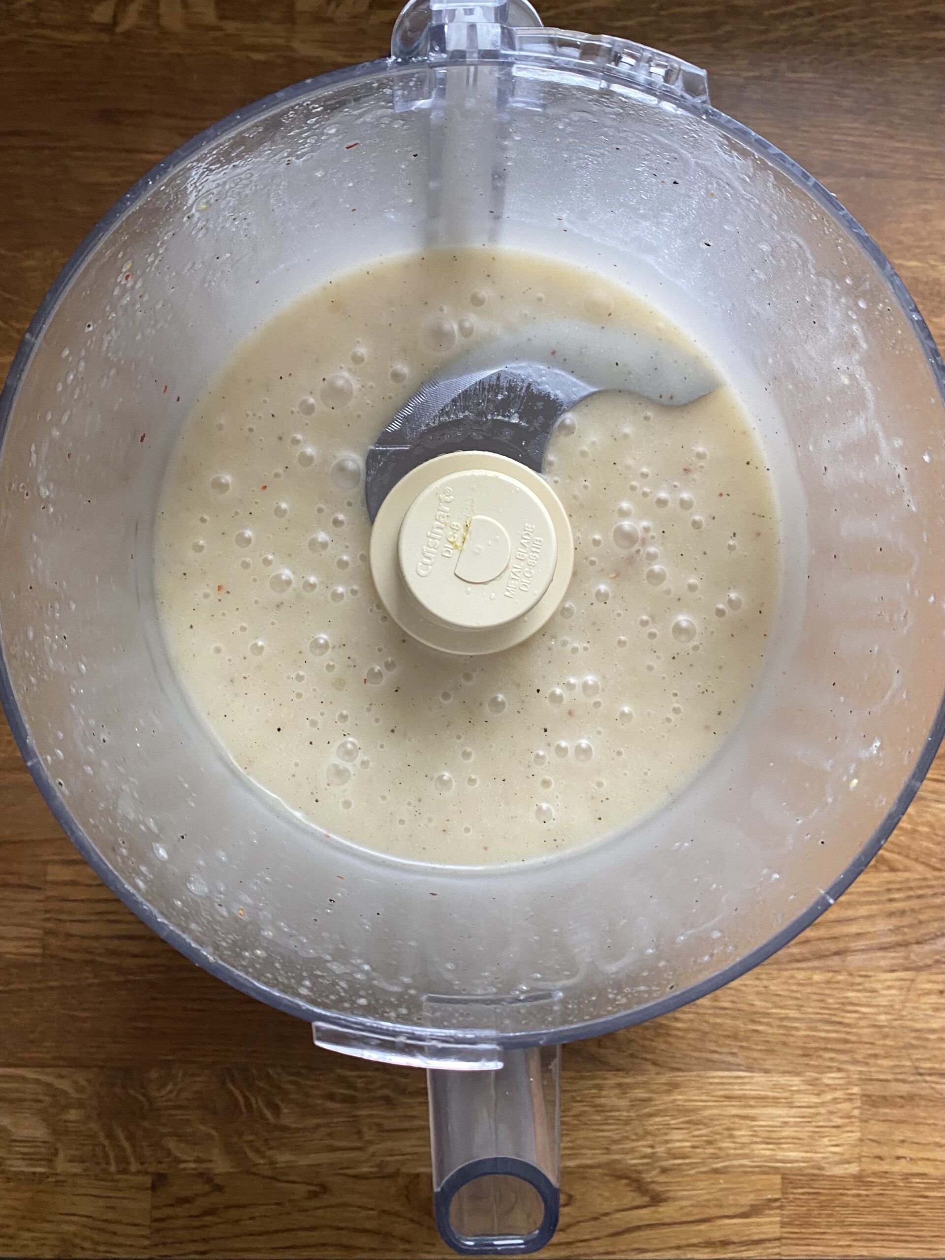 Turn the food processor on and slowly pour in the oil. It will take about 1 full minute to incorporate it all.