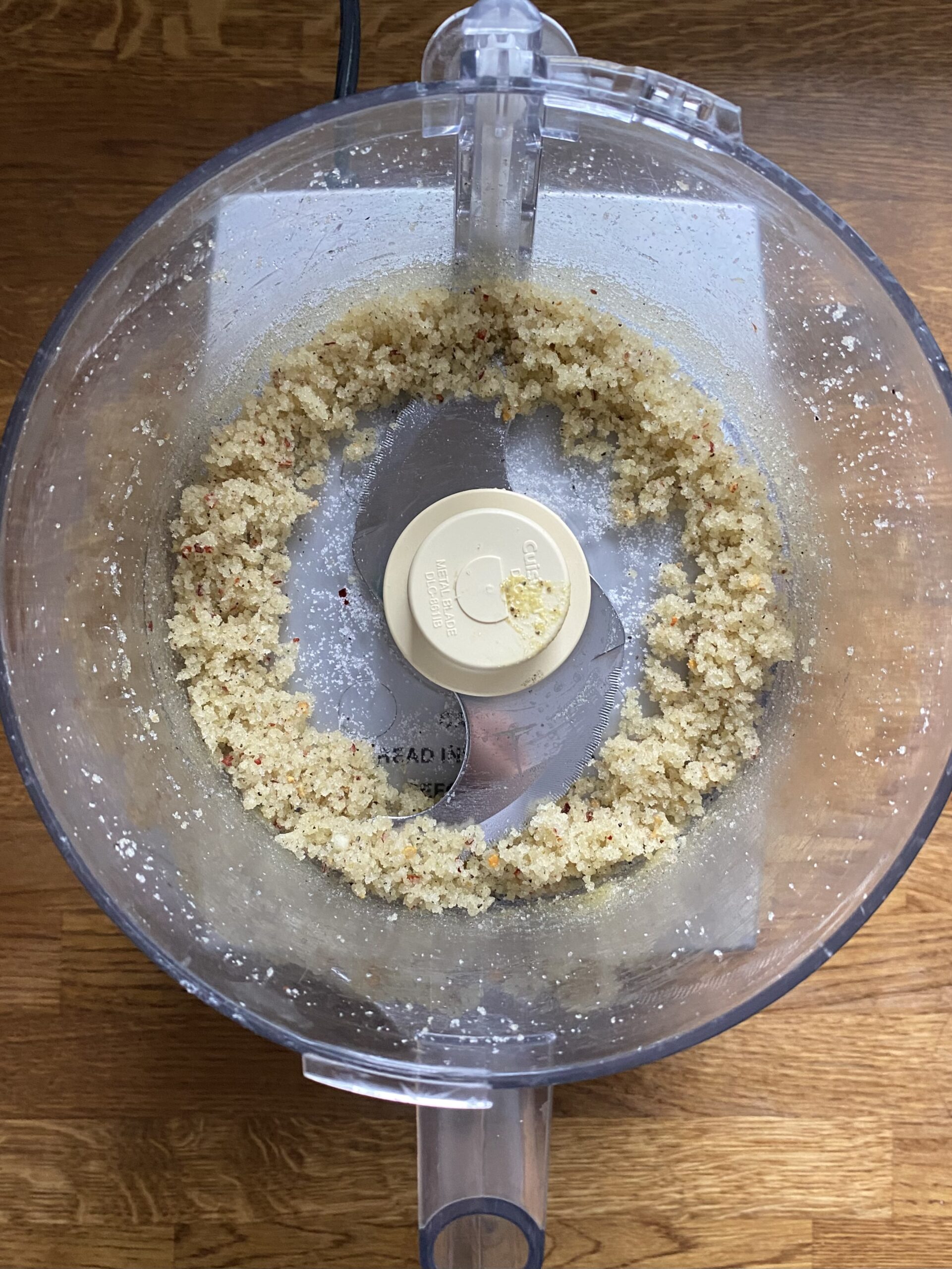 Add the sugar, garlic, mustard, salt, pepper, and crushed red pepper flakes to a food processor and pulse until well combined and garlic is in tiny pieces. Scrape down the sides of the food processor as needed while you do this!